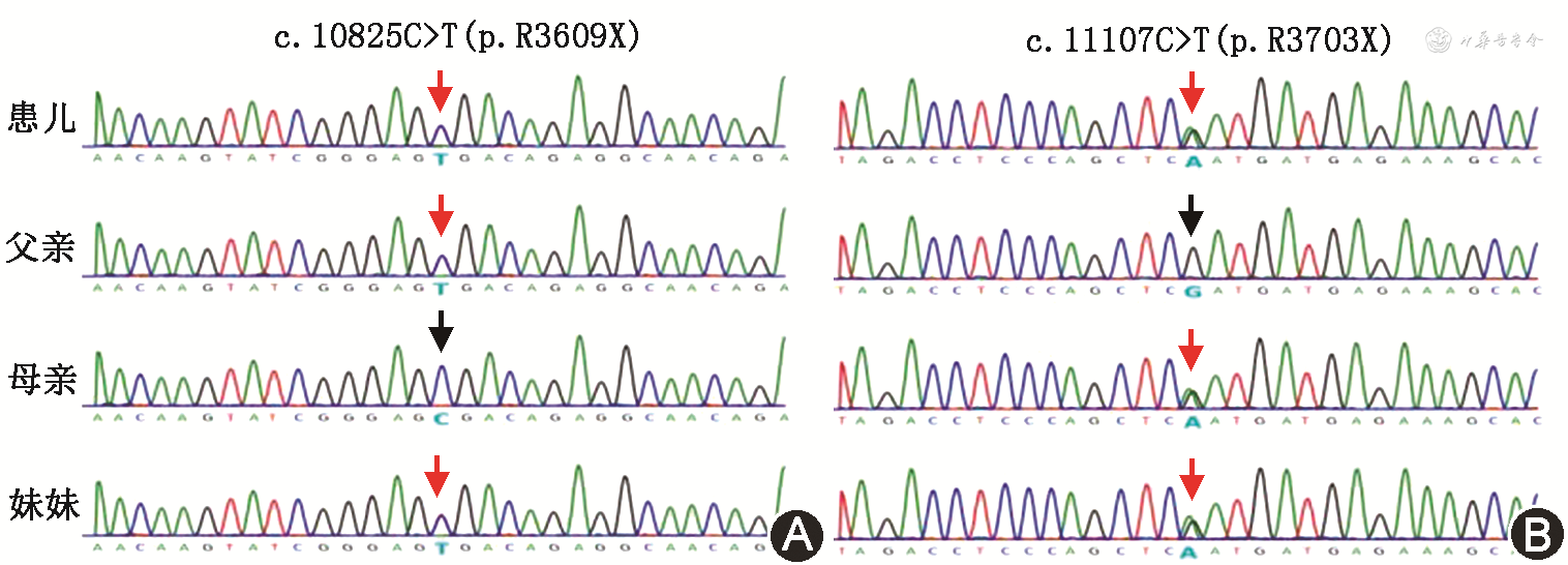 目前人类基因突变数据库收录的ALMS1基因突变种类有350余种,多数为无义突变,导致蛋白翻译的早期终止。外显子8、10及16为突变高发区,约半数以上的变异位于第8外显子[10, 11]。我国丁宇等[6]曾在7例中国AS病例中发现2例存在c.10825C>T(p.R3609X)变异,本例患儿基因同样检测到c.10825C>T(p.R3609X)变异,提示该位点可能为中国人群的热点变异位点,进一步验证还有待于我国AS病例的积累。