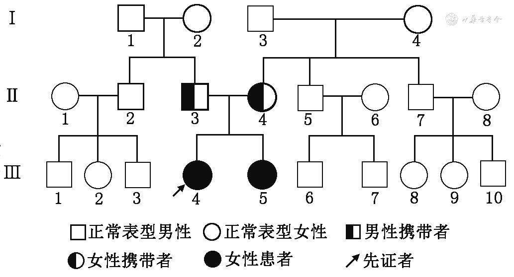 注:先证者(Ⅲ-4)及其父母(Ⅱ-3、Ⅱ-4)、妹妹(Ⅲ-5)已行基因检测,该家系其他成员未行基因检测