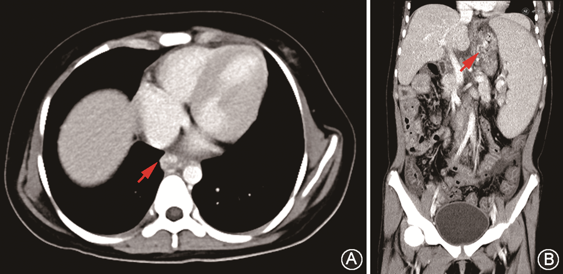 14个月后该患儿因“呕血伴黑便10余天”再次入院。急查血常规:血红蛋白53 g/L,血小板108×109/L。糖化血红蛋白6.78%。末梢血糖波动于5.6~15.0 mmol/L。肝功能:总胆红素90.1 μmol/L,直接胆红素37.0 μmol/L,间接胆红素53.1 μmol/L,总蛋白54.2 g/L,白蛋白33.5 g/L,丙氨酸转氨酶38 U/L,天冬氨酸转氨酶49 U/L,γ-谷氨酰转肽酶101.3 U/L。超声心动图:全心略大,左心室收缩功能测值正常,肺动脉高压[估测收缩压约40 mmHg(1 mmHg=0.133 kPa)],房水平左向右分流,二、三尖瓣少量反流。腹部彩色超声:肝光点增粗,分布欠均匀;脾大,腹水;食管胃静脉迂曲增宽(内径约2.2 mm)。腹部CT增强扫描:食管胃静脉扩张,肝脏、脾脏增大,腹腔积液,肠壁增厚伴渗出(图4)。该患儿最终诊断为:(1)AS;(2)食管胃静脉曲张出血;(3)重度贫血;(4)智力低下。入院后急予输注红细胞悬液补充血容量、生长抑素降低门静脉压力、奥美拉唑抑酸及药物止血等治疗;并予小剂量呋塞米及螺内酯减轻心脏负荷、卡托普利预防心肌重构。拟于波生坦降低肺动脉高压,但因肝功能异常暂缓口服。患儿此次消化道出血原因考虑为食管胃静脉曲张破裂出血所致,家属要求保守治疗,故未行内镜检查治疗及肝脏穿刺活检。经上述治疗后患儿消化道出血停止,病情好转出院,嘱其密切随访。