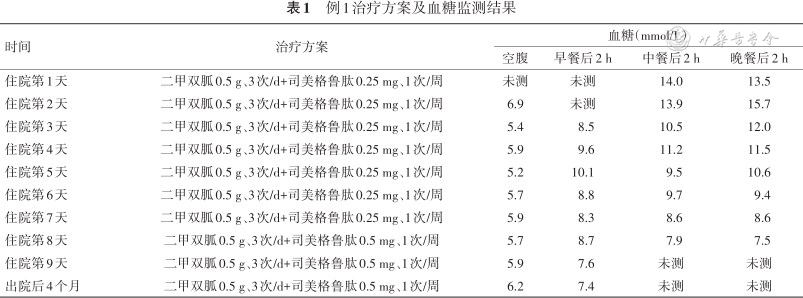 | 住院第1天 | 二甲双胍0.5 g、3次/d+司美格鲁肽0.25 mg、1次/周 | 未测 | 未测 | 14.0 | 13.5 |
