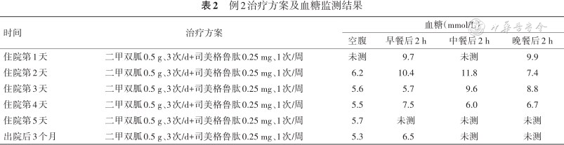 | 住院第2天 | 二甲双胍0.5 g、3次/d+司美格鲁肽0.25 mg、1次/周 | 6.9 | 未测 | 13.9 | 15.7 |