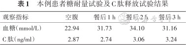 患者 男,30岁,因“口渴、多饮、多尿、消瘦1个月”为主诉收入住院。患者1个月前无明显诱因出现口渴、多饮(每天约3 000 ml)、多尿(每天约3 000 ml)、消瘦(体重近1个月下降12 kg),无视物模糊,无四肢麻木疼痛不适,无间歇性跛行,无发热、咳嗽、咳痰,无胸闷、气短,无腹痛、腹泻等不适,就诊于我院,查糖化血红蛋白(glycated hemoglobin A1c,HbA1c)12.87%(参考值4.0%~6.0%),糖耐量试验及C肽释放试验结果见表1,为求进一步诊治,门诊以糖尿病收入我科。自患病以来,患者精神、饮食、睡眠可。既往有高血压病史3年,血压最高220/180 mmHg(1 mm Hg=0.133 kPa),平素口服硝苯地平控释片(30 mg,1次/d)、缬沙坦(80 mg,1次/d)治疗,血压控制在(110~160)/(90~110)mmHg之间,高尿酸血症1年,3个月前出现左足跟部肿痛,未予诊治,后自行好转。否认手术史,否认外伤史,否认输血史,对青霉素类、头孢类药物过敏。家族中姥姥、舅舅患有糖尿病,否认高血压、冠心病家族史。