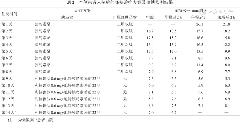 结合病史及检查结果,明确诊断为T2DM。入院后给予胰岛素泵(0:00—3:00用量为0.4 U/h,3:00—9:00用量为0.8 U/h,9:00—12:00用量为0.6 U/h,12:00—16:00用量为0.5 U/h,16:00—20:00用量为0.6 U/h,20:00—24:00用量为0.5 U/h)强化治疗,加用盐酸二甲双胍片(0.5 g,3次/d)口服降糖改善胰岛素抵抗,同时给予补液纠酮,逐步调整胰岛素泵泵速,患者血糖控制较前改善,FPG控制在5.5~7.0 mmol/L之间,餐后2 h血糖在5.6~8.3 mmol/L之间。患者无甲状腺、胰腺炎等疾病病史,无低血糖、终末期肾病,患者无GLP-1禁忌证,降糖方案过渡为利拉鲁肽0.6 mg每天皮下注射1次和地特胰岛素22 U每天睡前皮下注射1次,患者血糖平稳过渡,FPG在5.8~7.1 mmol/L之间,餐后2 h血糖在6.7~8.7 mmol/L之间,14 d后患者血糖控制良好(表2),过程中患者无药物不良反应,体重下降2.5 kg,遵医嘱出院。