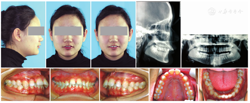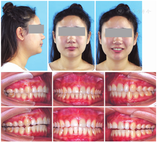 ,整体面型尚可,故采取了正畸掩饰性治疗。由于患者为低角型,具有较好的下颏部形态,磨牙Ⅱ类关系轻微,上前牙区散在间隙,上牙弓窄和下切牙舌倾,故采取了非拔牙矫治。排齐和整平上下牙弓,使用