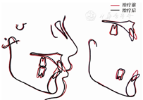 垫去除咬合干扰,改善上下牙弓形态,协调上下牙弓在横向、垂直向和矢状向上的关系。治疗前后重叠图显示在矢状向上,治疗后上颌第一磨牙位置基本保持不变,下颌磨牙近中移动,建立了磨牙中性关系;上切牙明显内收,下前牙唇倾,建立了正常的前牙覆盖关系;在垂直向上,治疗后下颌第一磨牙升高,下切牙压低,改善了前牙深覆