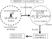 2006年,日本学者Takahashi等首次用腺病毒载体将4个转录因子:Oct3/4、Sox2、c-Myc和Klf4成功地转入小鼠尾部皮肤成纤维细胞,诱导成具有类似ESC生物学特性的干细胞(图2),并命名为iPSC[1]。该细胞表达ESC特异性细胞标志物,注入裸鼠皮下,可形成向3个胚层器官分化的畸胎瘤组织。此后,陆续有学者将Oct4、Sox2、c-Myc、Klf4和Oct4、Sox2、Nanog、Lin28两套基因转入人成纤维母细胞和胃上皮细胞中,也诱导出类似ESC的iPSC[2,3,4]。继之,Okita等用Nanog代替Fbx15进行筛选,最终得到了Nanog阳性的iP-SC细胞系,该细胞系不仅在细胞形态、生长状况、标志物表达、移植到小鼠皮下可形成畸胎瘤等方面,与小鼠ESC极为相似,且在DNA甲基化方式、基因表达谱、形成嵌合体动物等方面也与小鼠ESC具有相似特性[5]。