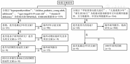 在美国国立医学图书馆生物医学检索系统(PubMed)、荷兰医学文摘检索数据库(EMBASE)等外文文献数据库,以及维普中文科技期刊数据库、万方数据库、中国知网等中文数据库分别以英文关键词"hyperparathyroidism"、"children,pediatric,young adult or adolescent"、"ages ranged 0–19 years old"、"vitamin D deficiency"和中文关键词"甲状旁腺功能亢进症"、"儿童或青少年"、"维生素D缺乏"检索近5年(2009至2014年)与疾病诊治相关的国内外文献(图1)。英文检索限制条件为"5 years"(出版时间在5年以内),"human"(人类)和"English"(英文)。文献入选标准为文献回顾、数据回顾、回顾性研究、系统评价或临床随机对照试验(randomized control trial,RCT)。