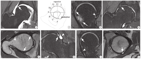 MRI序列:横断面质子密度加权像(PDWI)及冠状面、斜矢状面(平行于股骨颈长轴)的质子密度加权脂肪抑制像(PDWI-FS)。横断面质子密度加权像除可观察盂唇之外,还有助于观察髋臼骨质情况。