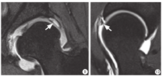髋关节直接MR关节造影(d-MRA)斜矢状面图像显示前盂唇与髋臼分离(白箭)