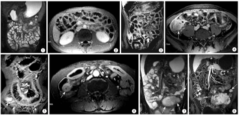 MR小肠造影和MR小肠灌肠至今仍无统一的肠道对比剂,应用较多的对比剂有甲基纤维素水、聚乙烯醇、稀释硫酸钡溶液等[3,4,5, 9,10]。本研究中,笔者应用了2.5%等渗甘露醇溶液,是因为甘露醇味微甜、口感好容易被人接受、等渗、不被人体吸收、容易充盈肠管、不会因为高渗而引起严重腹泻,也不会因为口服纯水被人体吸收而不能充盈肠管。本组病例患者均顺利完成了检查,除2例Crohn病患者感轻度恶心外,其余患者均无呕吐、腹痛等其他不良反应或原有的症状加重。由于等渗甘露醇多不被人体吸收,所以通过大便排除体外,易给人造成腹泻的假象,只要排除服用的液体后,腹泻就可停止。由于活动期Crohn病的胃肠道虚弱,敏感性增高,口服大量液体后部分患者可能会感到恶心,炎症肠管蠕动增加,可能会使腹泻次数增多,但排除液体后就会恢复。Van Weyenberg等[11]对一组志愿者摄入纯水、等渗甘露醇和另外两种胶浆后行小肠MRI对照研究后认为,纯水对肠道扩张效果最差,等渗甘露醇对肠道扩张效果最好,小肠的形态显示最佳,并且无恶心、呕吐及腹痛等副反应。