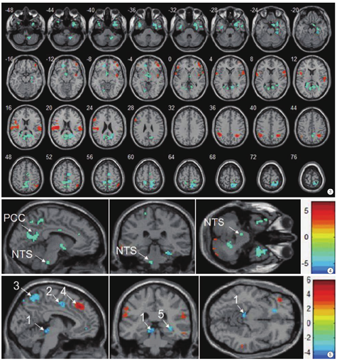负激活区:广泛而较强的负激活脑区。延髓部负激活区相当于左侧孤束核位置;大脑部主要分布于顶上回BA7(precuneus),前中央回BA4;边缘叶系统:后扣带回BA31、23、29、30,双侧颞极BA38及下颞回BA20,双侧下丘脑、旁海马回,海马和杏仁核,左侧腹内侧前额叶BA10。另外可见于前辅助运动皮层BA6内侧部,小脑。激活区:主要位于左侧体感Ⅱ区,双侧顶叶下回BA40,右颞上回,左侧岛叶前部,额下外侧回BA44、BA47及额极部。