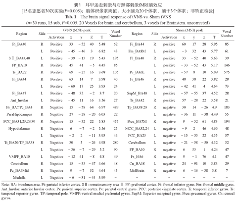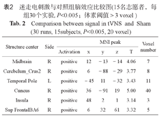 两组电流、感觉频率及强度未见明显区别。经皮电刺激耳甲部tVNS正常人激发了左侧孤束核及边缘叶脑区广泛而较强的负激活效应,局限性激活位于体感区及岛叶等,而对照部产生了右侧三叉神经核等脑干核团负激活及脑部体感区明显的激活现象。