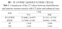 弹力纤维瘤与前锯肌平扫/增强CT值比较