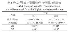 弹力纤维瘤与周围脂肪平扫/增强CT值比较