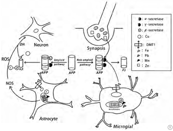 Aβ肽类物质堆积造成细胞损伤及功能障碍,是AD主要的病因之一。Aβ的常见两种形式为:Aβ(1-42)、Aβ(1-40)。Aβ(1-42)毒性更强,先于Aβ(1-40)沉积,是AD患者的重要检测指标。Aβ(1-42)/(1-40)比值与AD发病概率成正相关,Aβ(1-42)/(1-40)比例的降低可以抑制Aβ沉积,降低AD发病概率[2,3,4]。近来关于AD病因,金属离子假说也可到一些认可。资料表明,重金属离子及某些类金属离子,具有细胞毒性,在长期处于低浓度环境或中毒水平时,可以穿过血脑屏障引起神经元退行性变,造成脑损伤。除此之外,脑内维持细胞正常生理功能的金属离子,如钾、钠、铁、锰等离子平衡被打破,会是诱发AD的因素之一;金属离子与Aβ之间直接产生相互作用,促进Aβ沉积及淀粉斑块形成;离子也可参与到淀粉源性Aβ形成过程,与有金属连接位点的分泌酶相互作用,促进Aβ生成[5]。