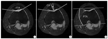 运动医学研究发现,正常人屈膝初期髌骨从起始位置向远端滑移的同时也开始向膝关节内侧移动,屈膝至15°~30°时,髌骨内移逐渐达到最大,然后转向外侧移动,至屈膝40°时,髌骨又回到中位线上[20]。而髌股关节不稳的患者在膝关节屈曲15°~45°时髌骨中心从初始外移位置持续向外侧移动[21,22],因此30°时正常人与患者的差异可能更显著,这种运动轨迹的差异同样体现MR图像上[23]。评估髌骨脱位/半脱位时常用适合角(congruence angle,CA),即股骨滑车沟最低点和髌骨中央脊的连线与FTA的平分线所形成的夹角(图2),此角在平分线的外侧为正值,正值越大说明髌骨越向外移,>16°可以诊断半脱位[24]。多数文献表明,髌股关节不稳的患者与对照组的CA在屈膝<30°时差异较明显[25],且屈曲30°时髌骨半脱位的发现率高于0°及45°[26],因为此时髌骨的运动受滑车凹及伸膝装置的影响尚小,髌骨最不稳定;而屈膝>30°时,伸膝装置紧张度增加、滑车凹骨性突起等因素会减轻髌骨移位,因此轻微的髌骨脱位不能被确切反映出来。