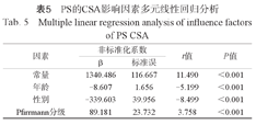 以进入概率为α≤0.05,移出概率α≥0.01进行多元线性回归分析,所有回归分析模型P值均小于0.001,多元线性回归分析表明性别、年龄和腰椎间盘Pfirrmann分级是PS和MF的FF的独立影响因素(表2,表3),腰椎间盘Pfirrmann分级是ES的FF的独立影响因素(表4);性别、年龄和腰椎间盘Pfirrmann分级是PS和MF的CSA独立影响因素(表5,表6),性别和腰椎间盘Pfirrmann分级是ES的CSA独立影响因素(表7)。