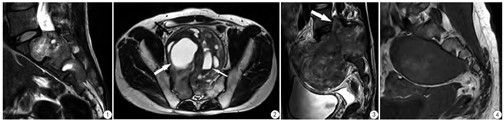 骶椎神经鞘瘤具有偏心性破坏和骶前侵犯特性。T2WI上稍高信号与高信号及其差异性强化是该瘤的MRI表现特征。