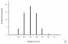 (1)受侵脊椎节段:19例神经鞘瘤侵犯的脊椎节段范围,自L5~S5。其中限于骶椎的15例,累及1~4个节段;跨腰骶椎的4例,累及3~5个节段。总共55节段中,S1~S3集中了46个(图5)。(2)与中线关系:第1~3型均有显著骶椎骨质侵犯,其轴位分布见表2;第2~4型均见明显骶前软组织肿块,其轴位分布见表3。(3)前后向侵犯:26例神经鞘瘤5个区域软组织肿块频数,依次是椎前22、脊椎21、椎管18、椎板14、椎板后12。椎前软组织肿块出现率,高于椎板和椎板后(χ2=13.066,P=0.011)。