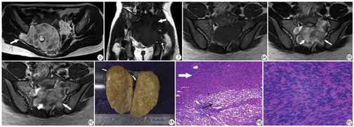 (1)以臀肌为参照,瘤体实质T1WI上呈等信号、稍低信号。T2WI上信号不均,呈2区基本信号改变:Ⅰ区,以稍高信号为主,间有部分等信号;Ⅱ区,以高信号为主,间有部分稍高信号与极高信号。Ⅰ区、Ⅱ区间隔排列,排列形式具多样性。两区大小范围,在同一瘤体不同部位及不同病例间变化不一。增强后不均匀强化,Ⅰ区明显强化。Ⅱ区表现出明显差异性强化,自无强化至轻微强化不等,呈T2WI信号越高强化越弱趋势(图8)。(2)瘤内囊变多见,常同时合并出血。囊变灶呈圆形、卵圆形或不规则形液性信号,T1WI呈稍低、等或稍高信号,T2WI上以高信号为主,可单个、多个或累及大部分瘤体,多见低信号囊壁。出血灶呈特征性表现,可见黑白液平征,液平上多呈T1WI稍高、T2WI高信号改变,液平下呈T1WI、T2WI极低信号,壁呈T2WI低或极低信号环(图2)。