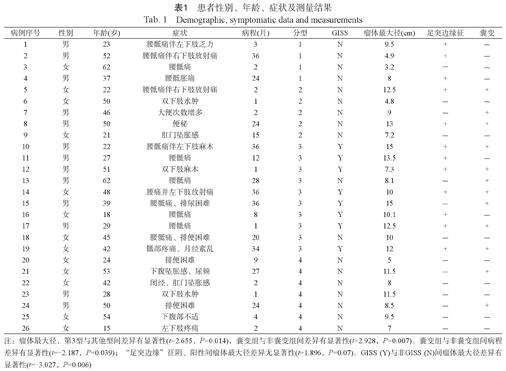 | 病例序号 | 性别 | 年龄(岁) | 症状 | 病程(月) | 分型 | GISS | 瘤体最大径(cm) | 足突边缘征 | 囊变 |