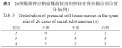 26例骶椎神经鞘瘤骶前软组织肿块在脊柱轴位的位置分布(例)