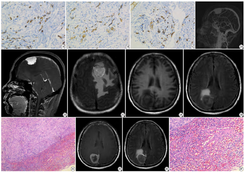 由两名分别有5年和4年经验的放射科医师评估。肿瘤直径测量于肿瘤在各方位上图像中的最大截面。若肿瘤存在脑膜尾征,则增强后"脑膜尾征"的T1和T2强化程度分3种类型统计:增强后T1WI显示更佳,增强后T1WI和增强后T2 FLAIR显示效果相差不大,增强后T2 FLAIR显示更佳,统计这3种类型的病例数。