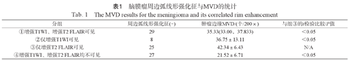 按照有无周边弧线形强化征分为4组(表1):①增强T1WI、增强T2 FLAIR可见;②仅增强T1 FLAIR可见;③仅增强T2 FLAIR可见;④增强T1WI、增强T2 FLAIR均不可见。每组MVD平均值先用用单样本非参数检验方法进行正态性检验。组②、组③、组④MVD数值都符合正态分布,用平均值±标准差表示;组①不符合正态分布,用中位数(四分位数间距)表示。组②、组④分别与组③两两采用两独立样本t检验统计方法;组①与组3进行Mann-Whitney非参数检验。统计结果如表1,表示4种不同类型的影像学表现均表现出脑膜瘤边缘MVD的不同情况。而且分组③仅增强后T2 FLAIR显示周边弧线形强化征的肿瘤边缘MVD计数明显大于分组④周边弧线形征阴性肿瘤边缘MVD。