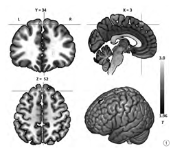 对比对照组,网瘾组内侧前额叶[团块大小=50体素;峰值点坐标(MNI空间):x=3,y=33,z=57)]显示增强的VMHC(VMHC值:网瘾组=0.45,对照组= 0.29,T=4.32,P<0.001),见图1。