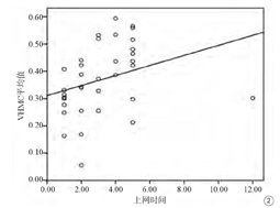 内侧前额叶平均VMHC值与网瘾组被试者的周上网时间存在显著正相关(r=0.48,P=0.003),见图2。