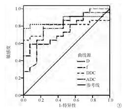 由于样本量较少,ADC、D、DDC值的AUC差距不显著,没有找到两组的临界值;多b值扫描时间较长,临床实用价值需要进一步验证。今后需增加样本量做进一步研究。