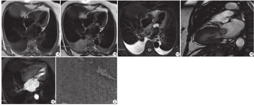 心脏血性囊肿由Elasser在1844年提出,在胎儿和儿童人群中常见,随着年龄增大而逐渐消失,故在成人群体中非常罕见[1]。血性囊肿多发生在房室间瓣膜,少数见于主动脉和肺动脉瓣[2]。目前,心脏瓣膜血性囊肿的发生最主要可能与血管内皮损伤有关[3]。其临床症状及体征不明显,因此大多数影像科医师不了解这个病变[4]。超声是诊断心脏瓣膜血性囊肿的首选方法[5],但是对于确定囊肿性质和分型有一定的难度。心血管磁共振成像(cardiovascular magnetic resonance,CMR)检查有助于了解病灶的大小、性质及周围软组织等信息。本例MRI平扫表现为:TSE T1WI呈等信号,T2WI和脂肪抑制序列呈高信号。心脏电影:在高信号的心血池衬托下呈低信号,囊肿位置和形态随心动周期没有明显改变。增强扫描:首过心肌灌注无明显强化,延迟扫描瘤体有对比剂充填与心血池信号相同。这一表现与Romano等报告的病例相符[6]。延迟增强扫描的表现与Cianciulli等[7]报道的病例表现不一致,推测本例囊肿与血管相通。鉴于此,还要与该部位好发的二尖瓣瘤、黏液瘤和乳头状纤维弹力瘤进行鉴别。二尖瓣瘤非常少见,表现为二尖瓣瓣叶突向心房的囊性病灶,但是与左心室通过瓣叶上的开口相同。因此该病变心脏电影收缩期充血扩张,舒张期排空萎缩,大小随心动周期发生变化,血性囊肿大小不随心动周期发生变化。黏液瘤有宽窄不一的蒂与二尖瓣相连,活动度大,病灶呈长或等T1、稍长T2信号,通常瘤体内信号不均匀。心脏电影显示病灶的位置形态随心动周期发生变化,增强扫描呈均匀与不均匀强化,延迟增强表现为瘤蒂和瘤壁的强化。乳头状纤维弹力瘤一般好发于主动脉瓣,其次为二尖瓣。表现为长T1、短T2信号,一般直径小于1 cm,增强扫描无强化考虑此诊断。