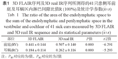 3D FLAIR序列及3D real IR序列所测得的41只患侧耳前庭及耳蜗区内淋巴间隙比值R (100%)及统计学参数(