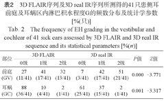 3D FLAIR序列及3D real IR序列所测得的41只患侧耳前庭及耳蜗区内淋巴积水程度频数分布见表2,3D FLAIR序列测得的GV≥1级的患耳占比约73% (30/41) ,GC≥1级的患耳占比约12% (5/41);3D real IR序列测得的GV≥1级的患耳占比约93% (38/41),GC≥1级的患耳占比约39% (16/41);3D real IR序列诊断出前庭、耳蜗区内淋巴积水的患耳数均多于3D FLAIR序列(PGV=0.000 ,PGC=0.001)。