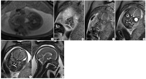 扫描序列采用HASTE序列(TR 1350 ms,TE 92 ms,扫描野400 mm × 400 mm,像素1.4 × 1.1 × 4.0,反转角170o,矩阵384 × 256,层厚4 mm,层间距0.8 mm,平均激励次数1,扫描时间25 s)和TRUE-FISP序列(TR 3.87 ms,TE 1.68 ms,扫描野400 mm × 400 mm,像素1.7 × 1.6 × 4.0,反转角60° ,矩阵256 × 144,层厚3~4 mm,层间距0~0.4 mm,平均激励次数1,扫描时间10 s),两个序列分别对胎儿头颅进行横断面、矢状面和冠状面扫描成像。扫描时控制SAR值在2.0 W/kg以下。