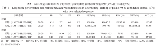 两名放射科医师用两个序列测定唇裂和腭裂的诊断性能比较[95%置信区间(CI)]