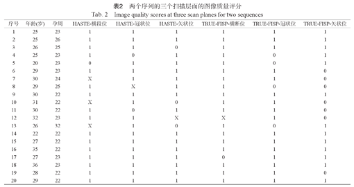 | 序号 | 年龄(岁) | 孕周 | HASTE-横段位 | HASTE-冠状位 | HASTE-矢状位 | TRUE-FISP-横断位 | TRUE-FISP-冠状位 | TRUE-FISP-矢状位 |