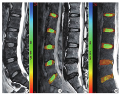 代表性腰椎矢状位T2WI图像及相应的T1rho后处理伪彩图像见图1。