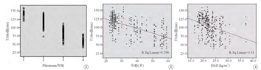 各腰椎间盘NP区T1rho值与年龄及BMI均呈负相关(r=-0.63,P<0.01;r=-0.33,P<0.01),随着年龄和BMI的增长,椎间盘NP区T1rho值呈减低趋势,见图3及图4。