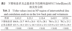 下腰痛患者及志愿者各节段椎间盘NP区T1rho值(ms)及相关性分析