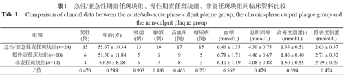 | 急性/亚急性责任斑块组(n=24) | 15 | 55.67±10.34 | 13 | 16 | 17 | 15 | 6.46±1.35 | 4.39±0.75 | 1.33±0.51 | 2.63±0.37 |