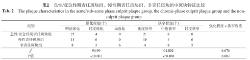 急性/亚急性期责任斑块、慢性责任斑块、非责任斑块数量分别为29个、20个、17个;3组的斑块强化程度、管腔狭窄程度差异有统计学意义(χ2=94.990,P<0.001 ;χ2=94.802 ,P<0.001);斑块强化和管腔狭窄的共同作用在3组中差异有统计学意义(χ2=6.676,P=0.003)。见表2。