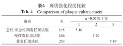 通过SNK法比较管腔狭窄程度与斑块强化程度,急性/亚急性期责任斑块、慢性责任斑块、非责任斑块的狭窄程度和斑块强化程度有差异;急性/亚急性期责任斑块组的管腔狭窄程度更严重(表3),斑块强化程度更明显(表4)。