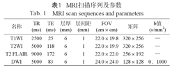 | 名称 | TR(ms) | TE(ms) | 层厚(mm) | 层间距(mm) | FOV(cm×cm) | 矩阵 | b值(s/mm2) |