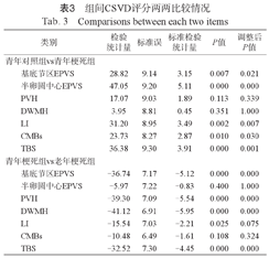 Kruskal-Wallis检验3组间CSVD各评分P<0.001 ,可以认为3组间CSVD评分差异具有统计学意义。经过两两比较,3组间患者TBS有显著差异(调整后P<0.001)。青年梗死组明显高于青年对照组,但显著低于老年组。