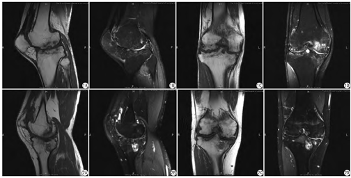 病例1,患者,男性,43岁,“因反复黑便2年,伴呕血3次”入院,两年前无明显诱因出现黑便,当地医院胃镜提示十二指肠球后溃疡并出血,反复治疗无效后至我院就诊,行走入院,否认遗传倾向性疾病及传染病家族史。查体:贫血貌,巩膜无黄染,全身皮肤黏膜无瘀点瘀斑,全身浅表淋巴结无肿大,胸骨无压痛,双肺呼吸音清晰,未闻及干湿啰音,心律齐,未闻及杂音,腹平软,无压痛,肝脾无肿大,双下肢无水肿,右上肢肘关节活动受限,双下肢关节畸形,伴活动受限;肌力、肌张力正常。实验室检查:白细胞4.1×109/L[参考范围:(3.5~ 9.5)×109/L],红细胞2.79×1012/L[参考范围:(3.8~ 5.1)×1012/L],血红蛋白84 g/L[参考范围:(115~ 150) g/L],血小板244×109/L[参考范围:(125~350)×109/L],网织红细胞比值为7.13%(参考范围:5%~15%),网织红细胞绝对值198.9×109/L[参考范围:(24~ 84)×109/L],尿酮体阳性,粪便常规及隐血实验:颜色棕黑,性状稀,隐血实验(+),活化部分凝血活酶时间(activated partial thromboplastin time,APTT) 103.5 s(参考范围:男性31.5~43.5 s;女性32~43 s),FIB 8.18 g/L(参考范围:1.75~5.54/L),VⅢ因子活性600% (参考范围:77.3%~128.7%),IX因子活性1%(参考范围:67.7%~128.5%)。MRI所见:T1加权像(T1WI)矢状位、冠状位(图1A、图1C)示:左膝关节间隙狭窄,髌骨形态增大并向前突出,关节构成诸骨边缘骨质增生变尖,关节面下骨质侵蚀、破坏、缺损,髁间窝加深;质子密度加权像(proton density weighted image,PDWI)矢状位、冠状位(图1B、图1D)示:左侧股骨下段、左侧胫骨上段见多发斑片、片状稍长T2信号及多发大小不等类圆形长T2信号。左膝关节滑膜增厚,骨软骨变薄、缺损;内外侧半月板显示不清;前、后交叉韧带肿胀见斑片状稍长T2信号。结合临床及实验室检查,诊断为血友病性关节炎。