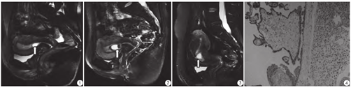 放射学评价指标:所采集图像均由两名副高及以上医师盲法阅片,描述病灶的形态、大小、生长方式等;于磁共振横断面图像测量病灶长径、宽径,于矢状面图像上测量病灶高度;2名放射医师均测三次数值,最后取平均值;由病灶的长径、宽径及高度计算孕囊体积。组织学评价指标:术后病理为绒毛及蜕膜组织。