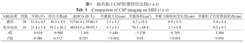 本组38例患者中有28例CSP在磁共振上表现为单纯囊性妊娠囊,呈类圆形、椭圆形的长T1WI长T2WI信号,境界清晰;10例表现为混杂包块型妊娠囊,MR上为类圆形、团状长T1WI、高低混杂T2WI信号(图1,图2,图3,图4);混杂包块型较单纯囊性妊娠囊有更大的最大径、孕囊体积以及与子宫疤痕相交长度,且差异具有统计学差异(P<0.05) (表1)。