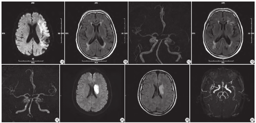 采用德国西门子Verio 3.0 T MR扫描仪,15通道头颅线圈。MRI检查包括T1WI、T2WI、DWI、FLAIR和3D-TOF MRA。扫描参数:(1) T1WI:TR 1800 ms,TE 9 ms,FOV 230 mm×227 mm;(2) T2WI:TR 4500 ms,TE 91 ms,FOV 220 mm×220 mm;(3) DWI:TR 4300 ms,TE 100 ms,b值为0,1000 s/mm2,FOV 230 mm×208 mm;(4) FLAIR:TR 7000 ms,TE 94 ms,TI 2215.2 ms,FOV 230 mm×208 mm;以上各序列层厚均为4.5 mm,层间距1.0 mm。(5) 3D-TOF MRA:TR 21 ms,TE 3.6 ms,层厚0.7 mm,FOV 230 mm×227 mm。