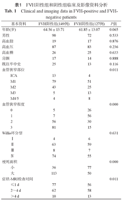 276例AIS患者,FVH阳性组149例,阴性组127例,患者基本资料如(表1)。统计分析两组之间年龄、性别、高血脂、高血压、高血糖、房颤及既往卒中病史差异均无统计学意义(P>0.05)(表1)。但结果显示高血压是脑梗死最常见的危险因素(170/276,61.59%)(表1)。